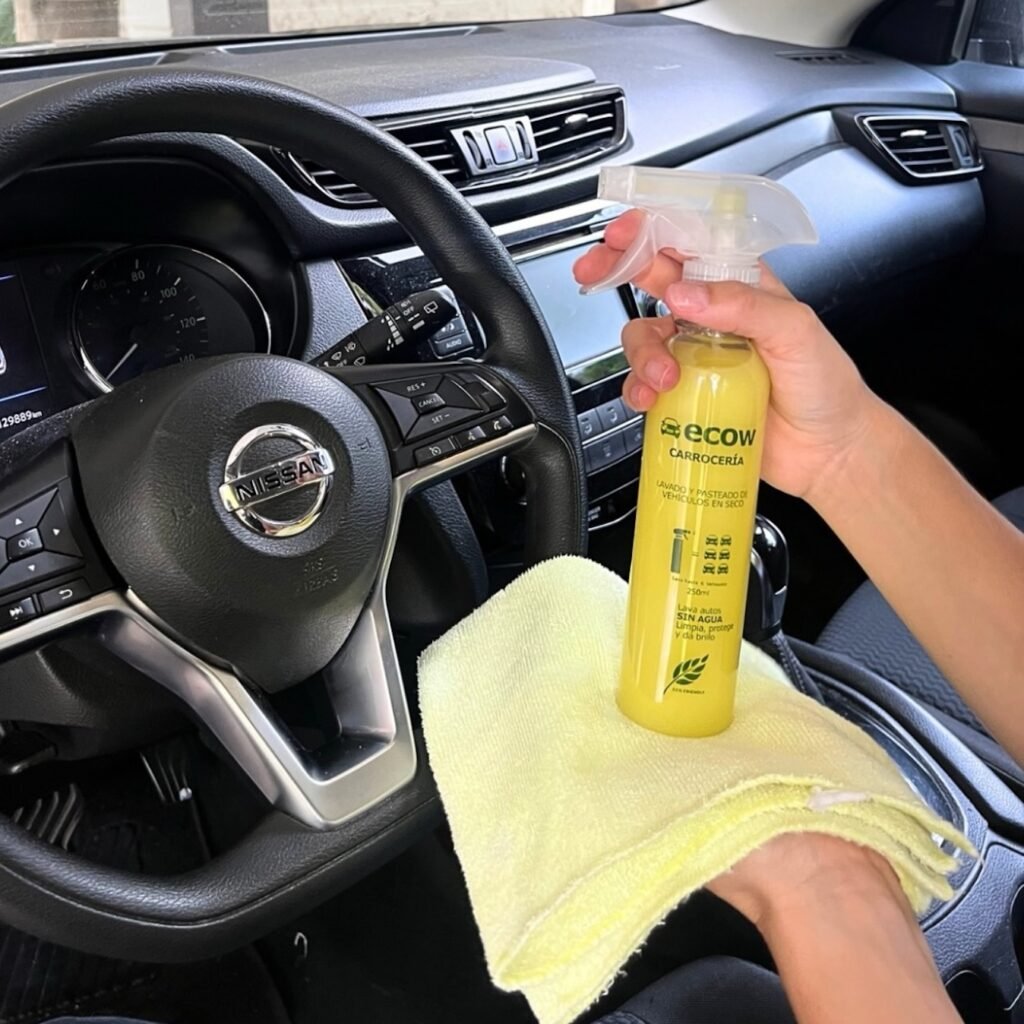 Eco W sirve para lavar y pastear el auto por afuera y limpiar todo el interior, incluyendo cuero, plástico, espejos, vidrio, madera, partes cromadas, pantallas de tv, etc… además es desinfectante.
